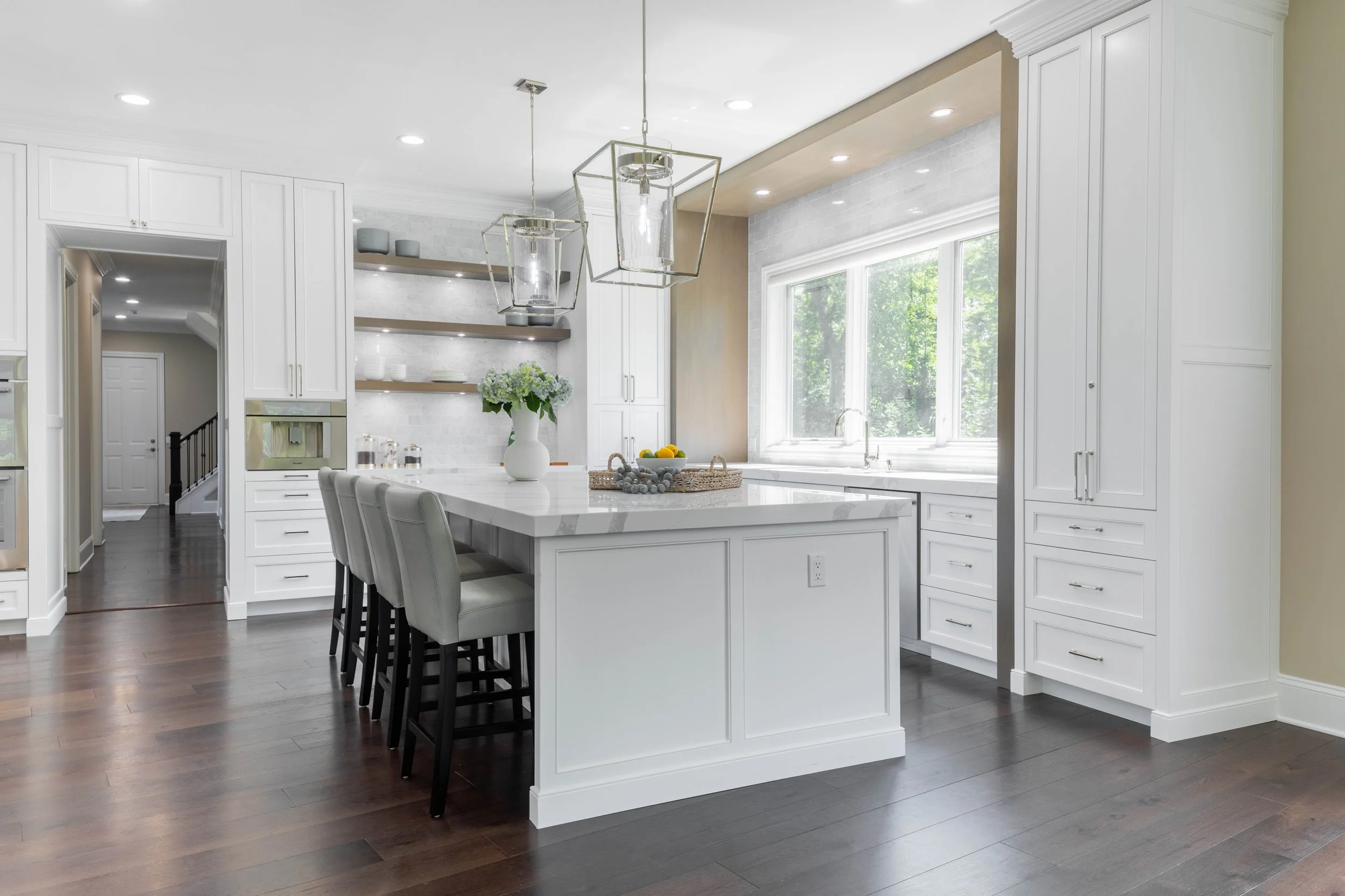 In our Tremendous Transformation project, we integrated white outlets into the ends of the island, allowing them to visually disappear into the white cabinetry while still offering convenient access.